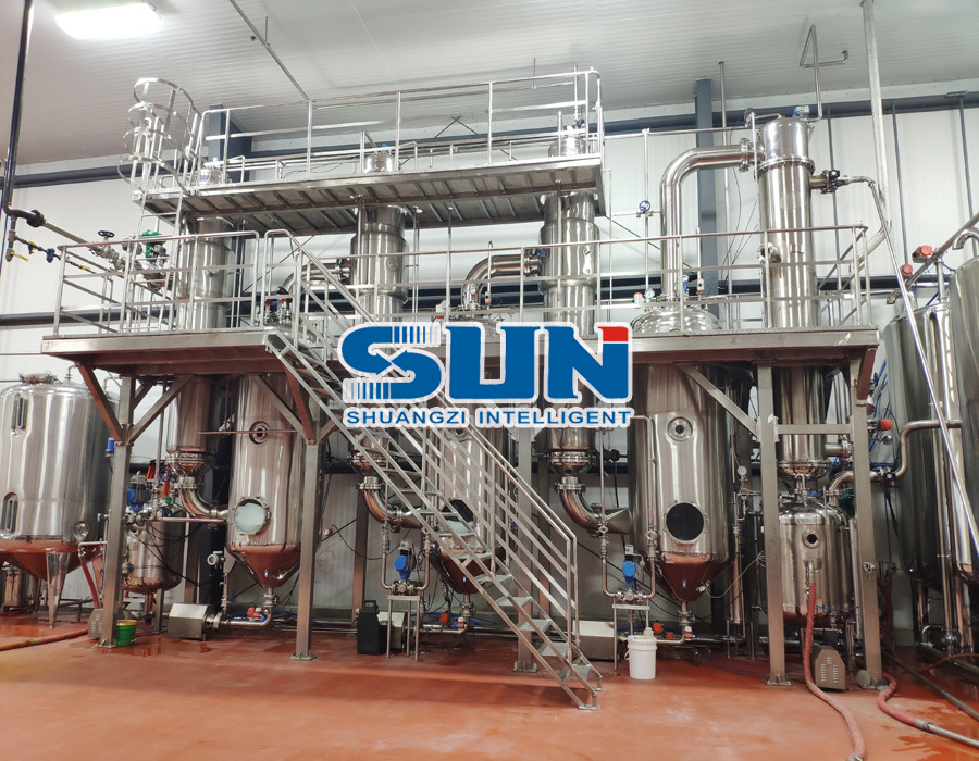 هسته اصلی عملکرد آن در دستیابی به غلظت گام به گام از طریق سه تبخیر کننده (یا محفظه تبخیر) به صورت سری است: مواد وارد لوله های گرمایش هر اثر از بالا می شوند و تحت تأثیر گرانش و بخار ثانویه ، یک فیلم نازک یکنواخت در امتداد دیوار لوله تشکیل می دهد و به سمت پایین جریان می یابد. به طور همزمان ، توسط بخار خارج از لوله ها گرم می شود و تحت تبخیر سریع و جداسازی رطوبت قرار می گیرد. بخار ثانویه ایجاد شده توسط اثر قبلی به عنوان منبع گرمایشی برای اثر بعدی عمل می کند ، تنها با یک اثر بخار تازه ، مصرف انرژی را به میزان قابل توجهی کاهش می دهد (در مقایسه با یک تبخیر کننده تک اثر ، مصرف بخار می تواند بیش از 60 ٪ کاهش یابد).